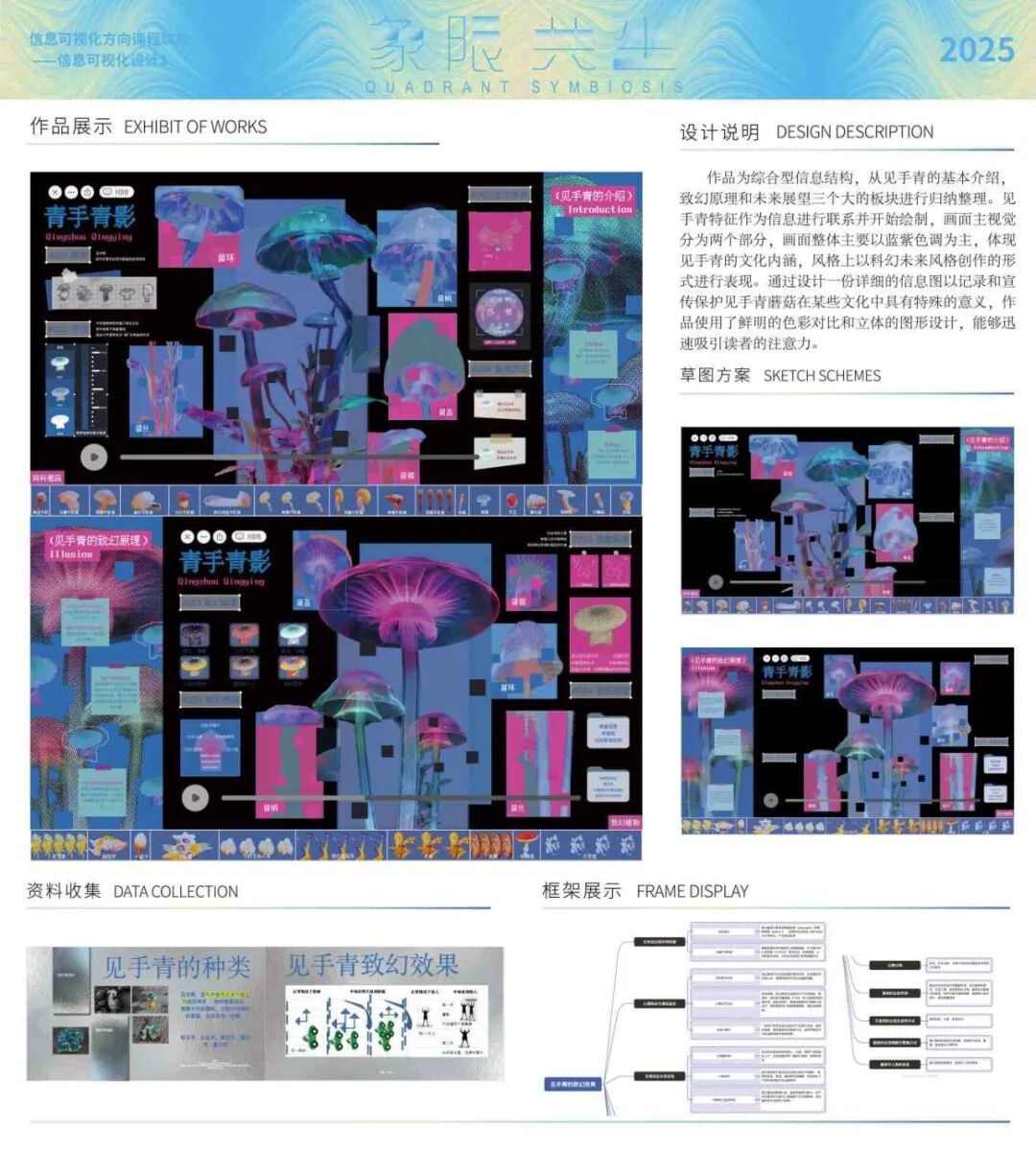 每一件作品都是学生对 “象限共生” 的独特诠释:有的以数据为骨、视觉为衣,让复杂的社会议题变得清晰可感;有的打破传统媒介限制,在数字与实体的融合中构建沉浸式体验;还有的在功能与美学的平衡中,实现信息传递的高效与诗意。这些作品或许稚嫩,却饱含对设计本质的思考 —— 让信息不再是单向的输出,而是设计师与观者、数据与生活、理性与感性的共生对话。
