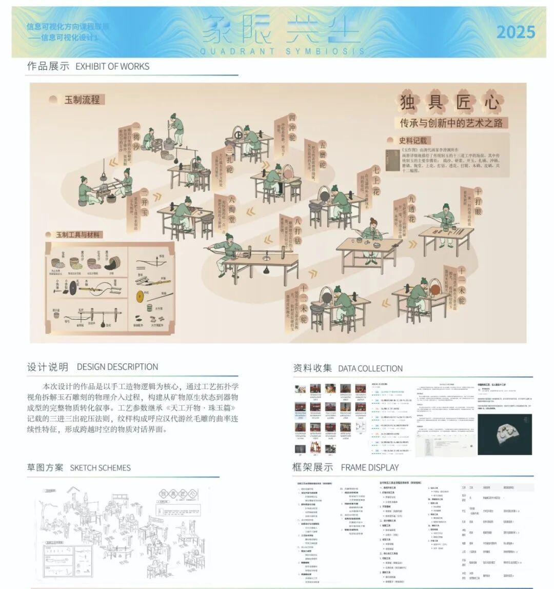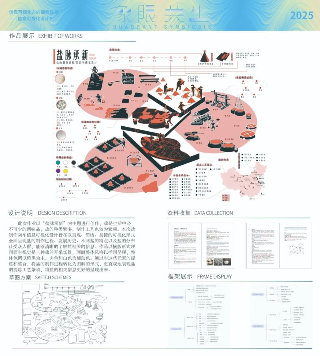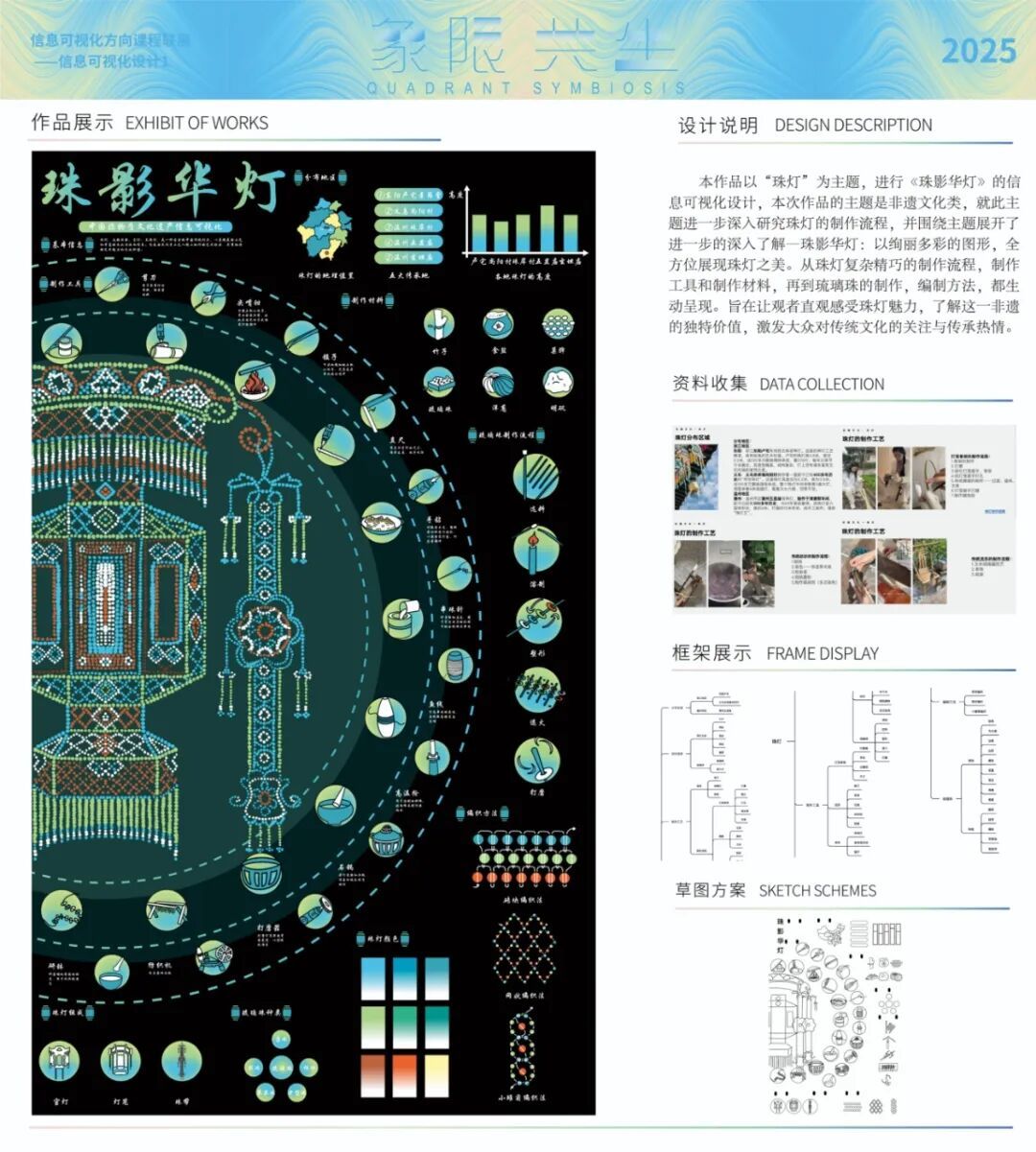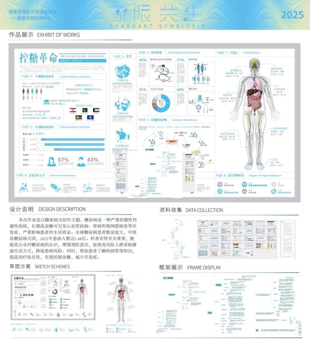当数据挣脱冰冷的数字牢笼,当设计跨越单一的表达边界,“象限共生” 便成为信息可视化设计的生动注脚。本次展览以 “象限共生” 为题,既是对信息可视化设计方向课程教学成果的集中呈现,更是对设计中 “多元维度融合” 这一核心命题的探索与回应。