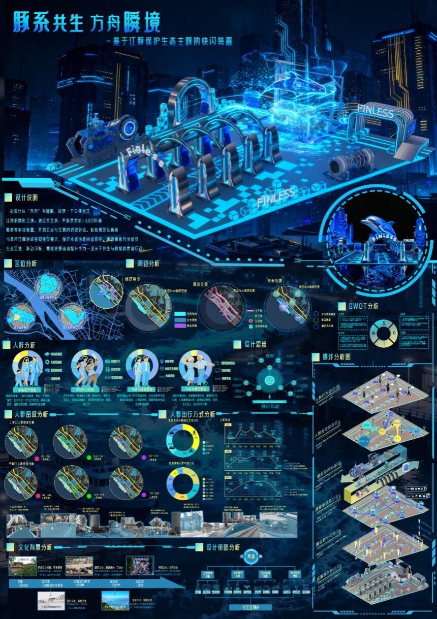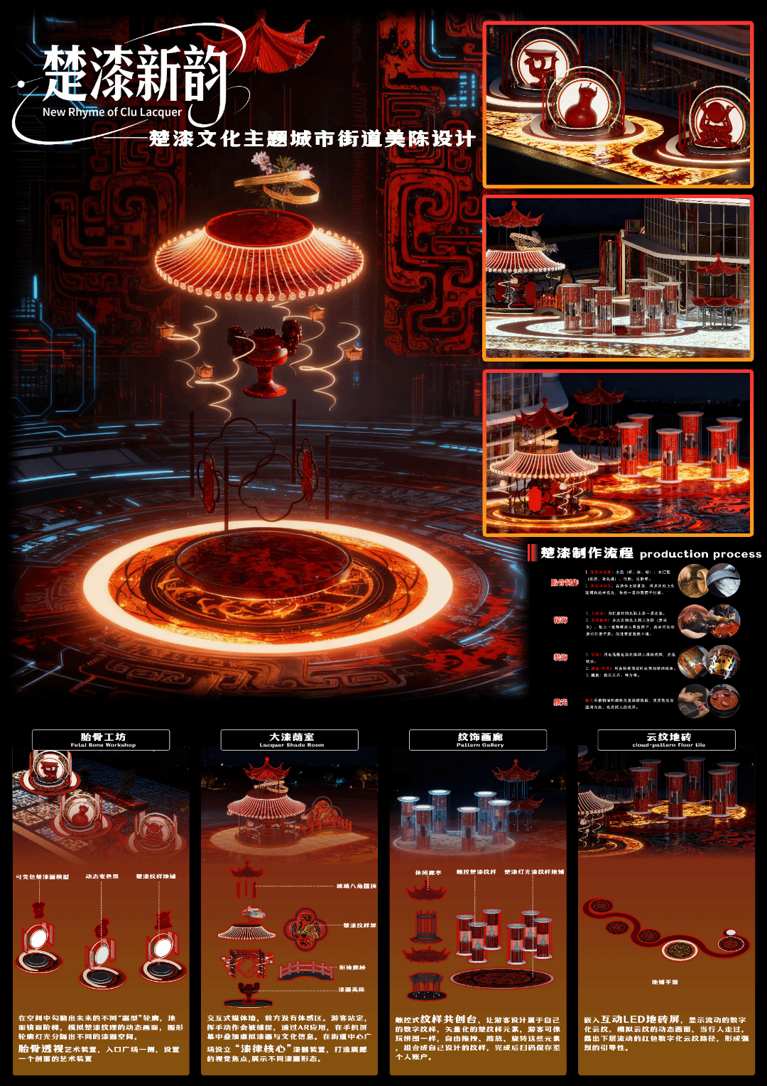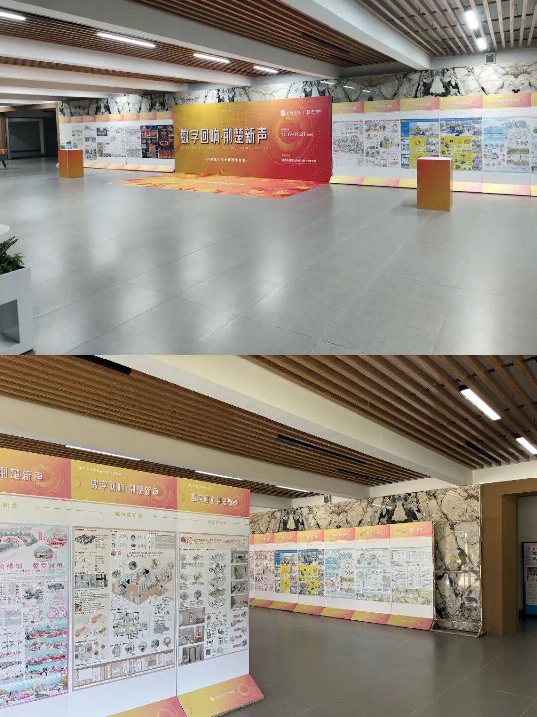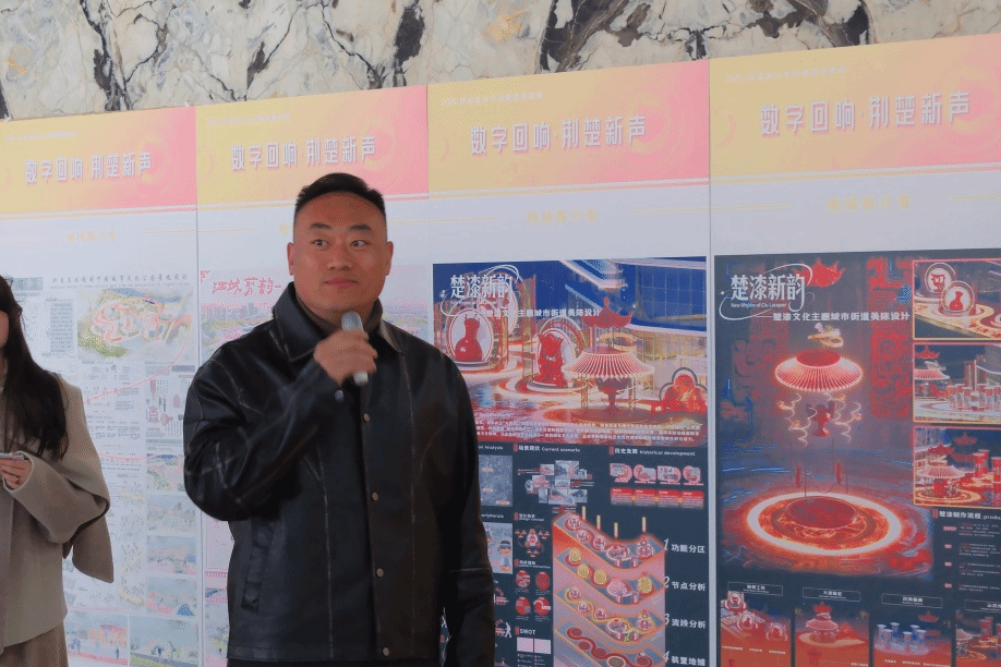 本次“数字回响·荆楚新声”成果展,聚焦于“数字技术”与“地域文化”的碰撞与融合,旨在展现数字时代背景下,青年学子如何重新发现、解读并创造性转化荆楚文化的深厚底蕴。展览汇集了《室内设计原理》、《景观设计原理》、《室内专题设计》、《景观专题设计》、《文化空间室内设计1》、《文化空间景观设计1》、《文化空间景观设计2》、《商业空间景观设计2》、《专业考察》等多门核心与特色课程的教学成果。作品方向涵盖“地域振兴”、“城市更新”、“AIGC赋能” 与 “红色文化” 等多个实践领域,充分体现了学生们在掌握专业技能的同时,主动运用数字化工具,深入挖掘地域文脉,积极回应社会议题的自觉意识与实践能力。