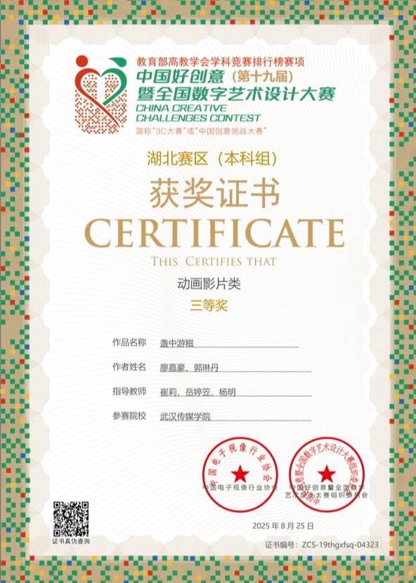 本作品荣获了第十九届中国好创意暨全国数字艺术设计大赛(湖北赛区),动画影片类,三等奖。