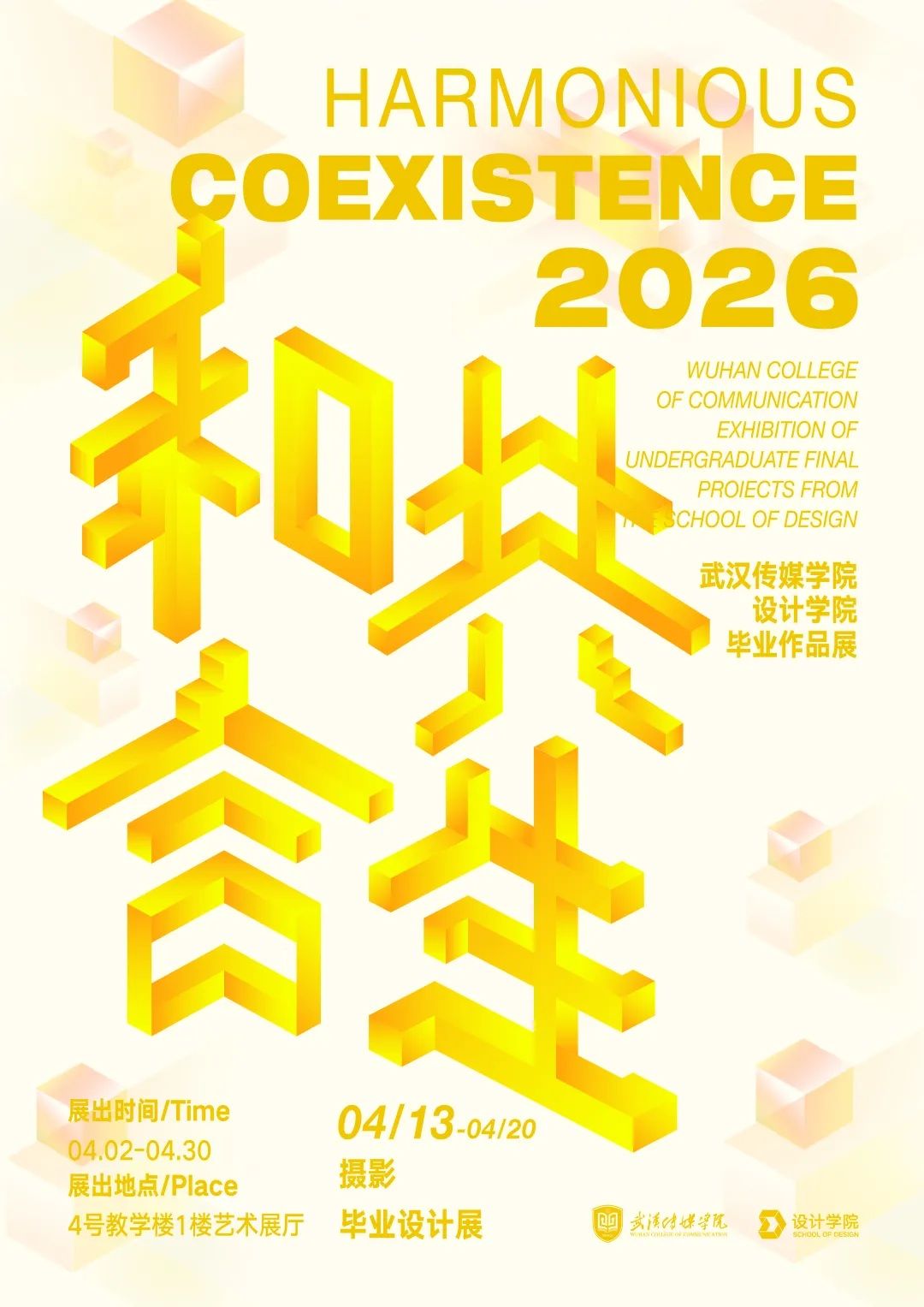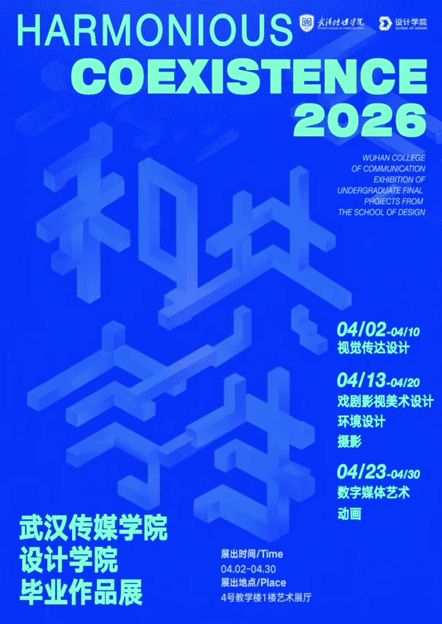 当传统文脉遇上数字浪潮,当创意思辨接轨时代前沿,“和合共生”成为武汉传媒学院设计学院2026届毕业生以设计回应时代、践行应用型办学定位的核心表达。本次展览集结视觉传达设计、环境设计、数字媒体艺术、动画、戏剧影视美术设计、摄影六大专业精品力作,以技术为翼、以创新为核,展现青年设计力量紧跟时代步伐、深耕地方文脉的探索与思考。
