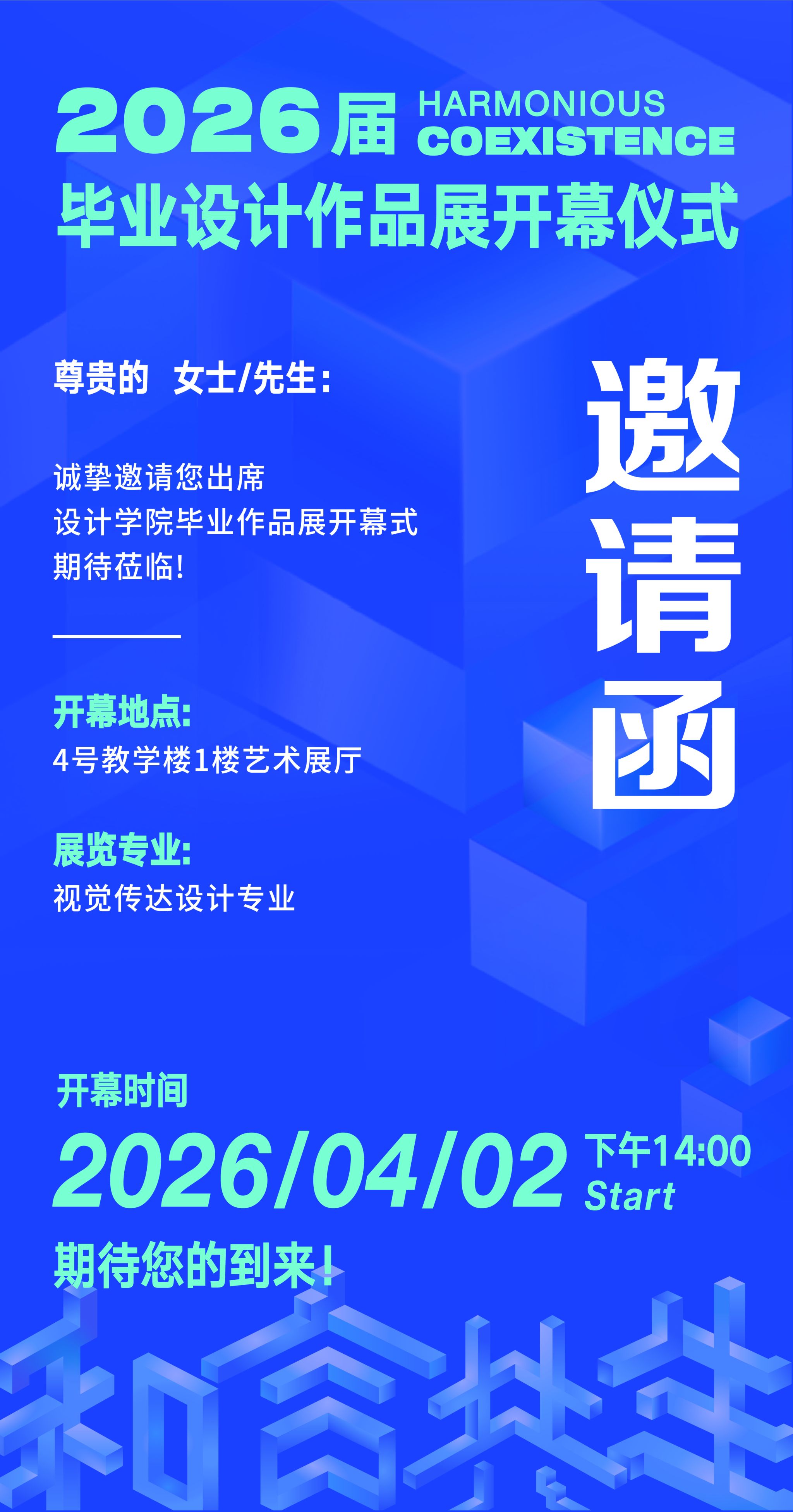 在设计边界消融、文化与科技交织的当下,“界”是传承与创新的起点,“融”是打破壁垒、赋能未来的力量。本次2026届视觉传达设计专业毕业设计展以“界·融”为主题,聚焦视觉设计跨界趋势,展现学子们以多元视觉语言,打破传统、链接文脉、拥抱革新,回应时代与行业需求,彰显突破自我的探索精神与设计的无限可能。