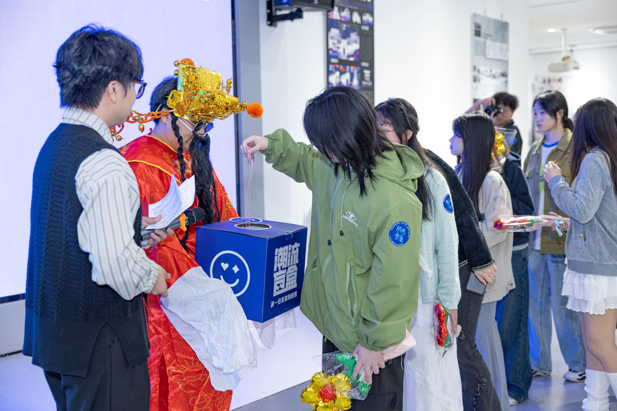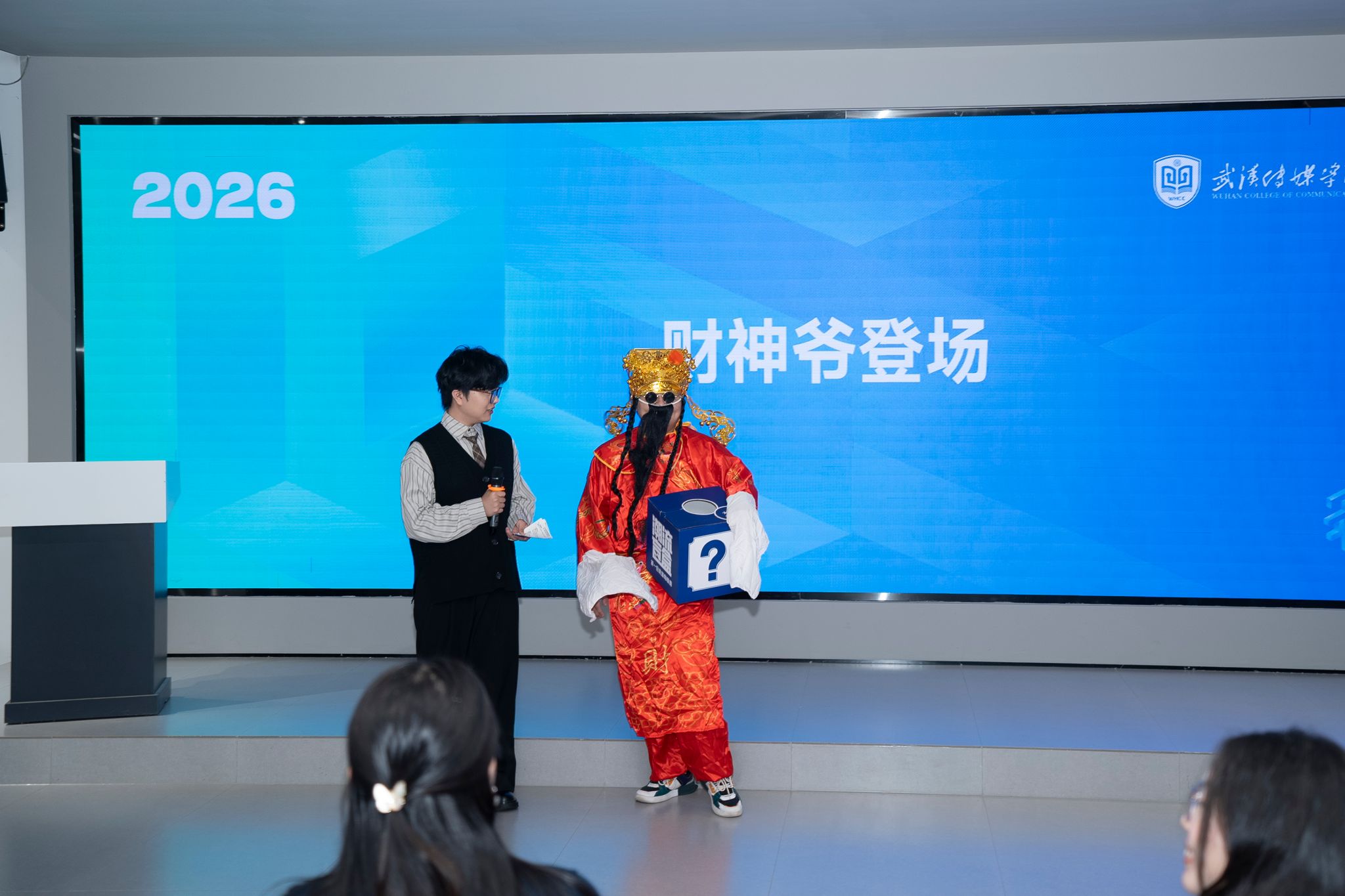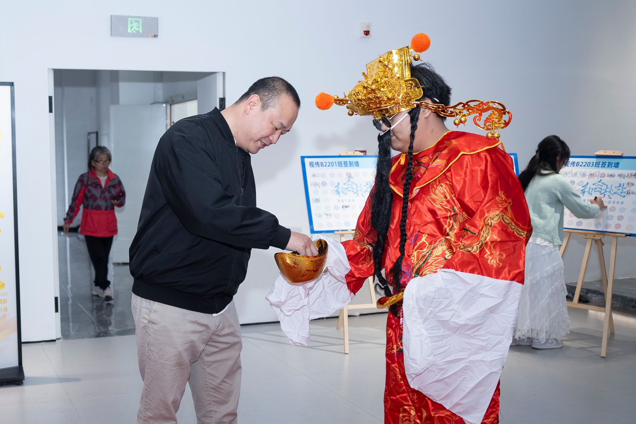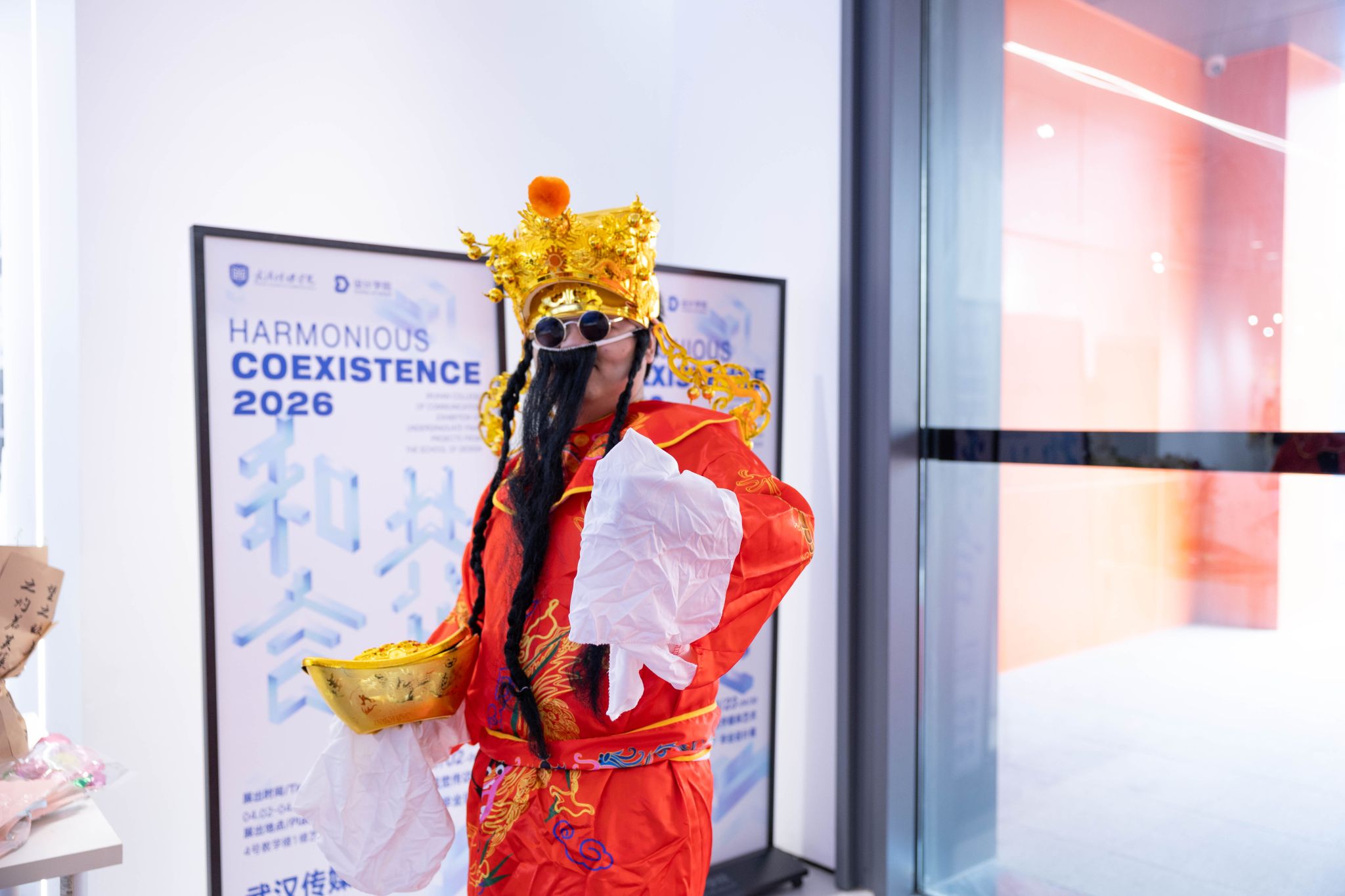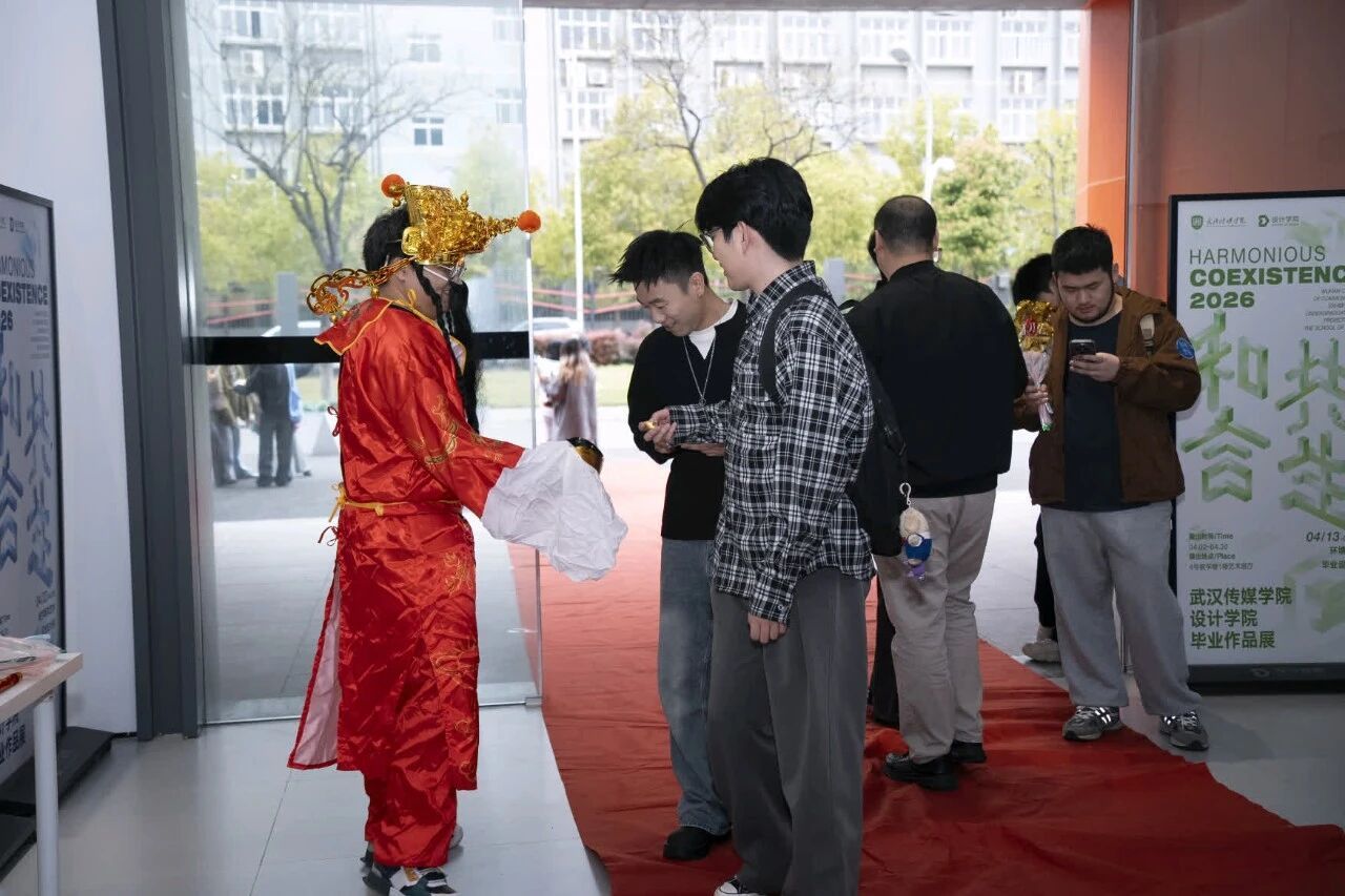开幕式彩蛋环节,“财神爷”张雨杨惊喜登场,身着喜庆红袍为全体师生送福。他现场派发金币巧克力,开启盲盒抽奖,送出学院专属心意礼,用满满的福气与好运,为2026届视传毕业设计展开幕式画上圆满句号,也为毕业生送上最滚烫的前程祝福。