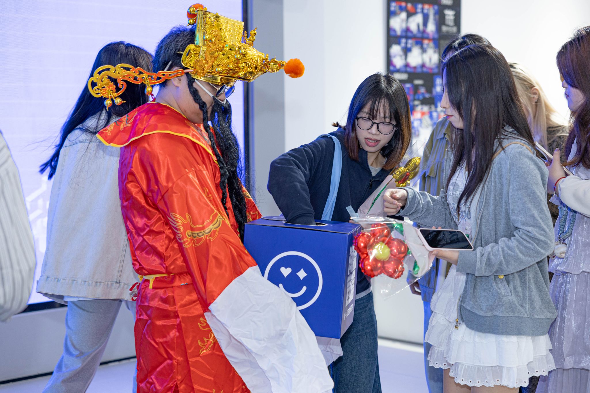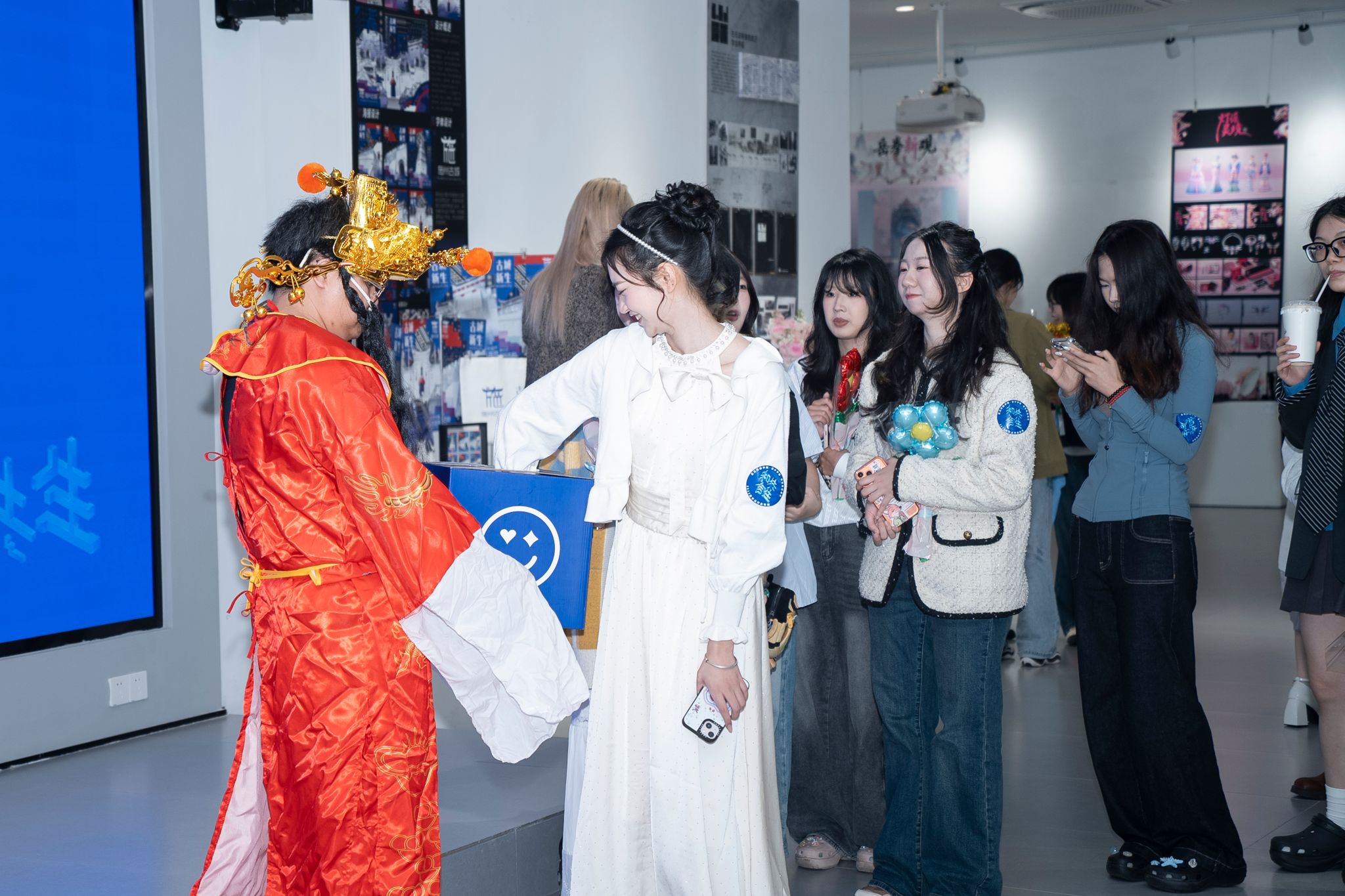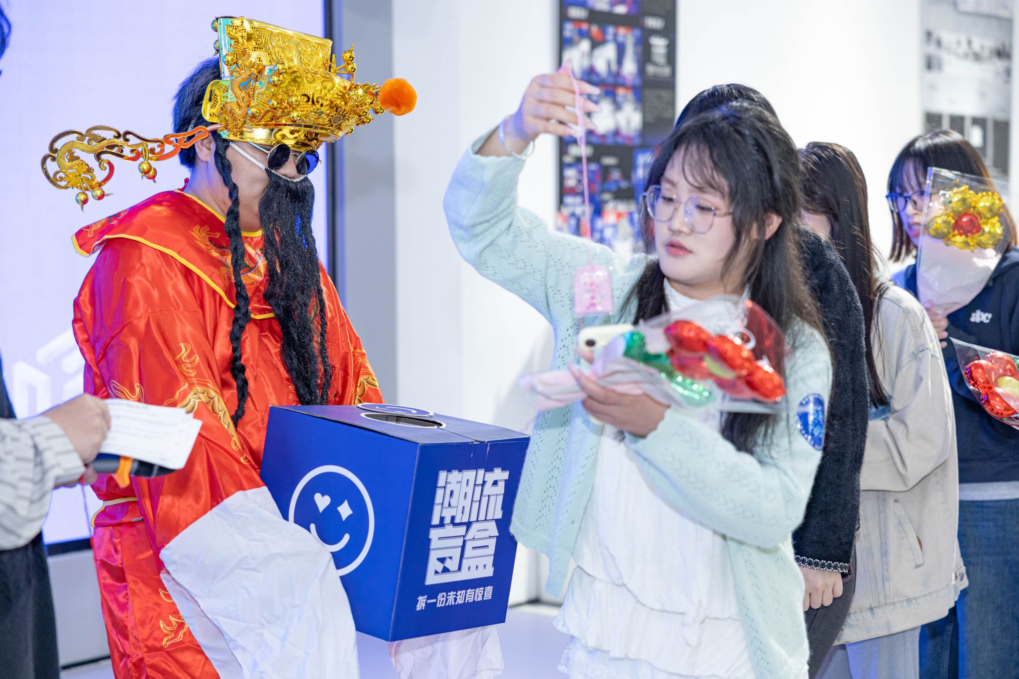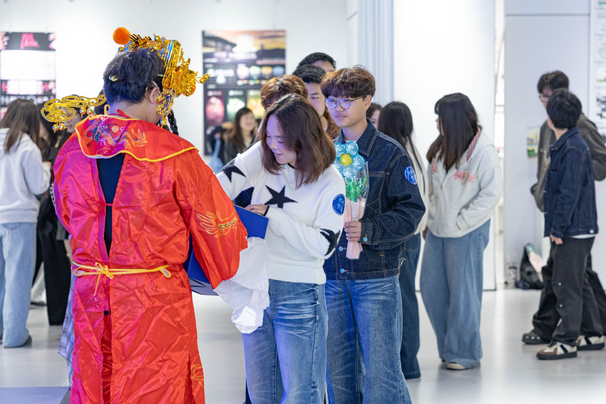 开幕式彩蛋环节,“财神爷”张雨杨惊喜登场,身着喜庆红袍为全体师生送福。他现场派发金币巧克力,开启盲盒抽奖,送出学院专属心意礼,用满满的福气与好运,为2026届视传毕业设计展开幕式画上圆满句号,也为毕业生送上最滚烫的前程祝福。
