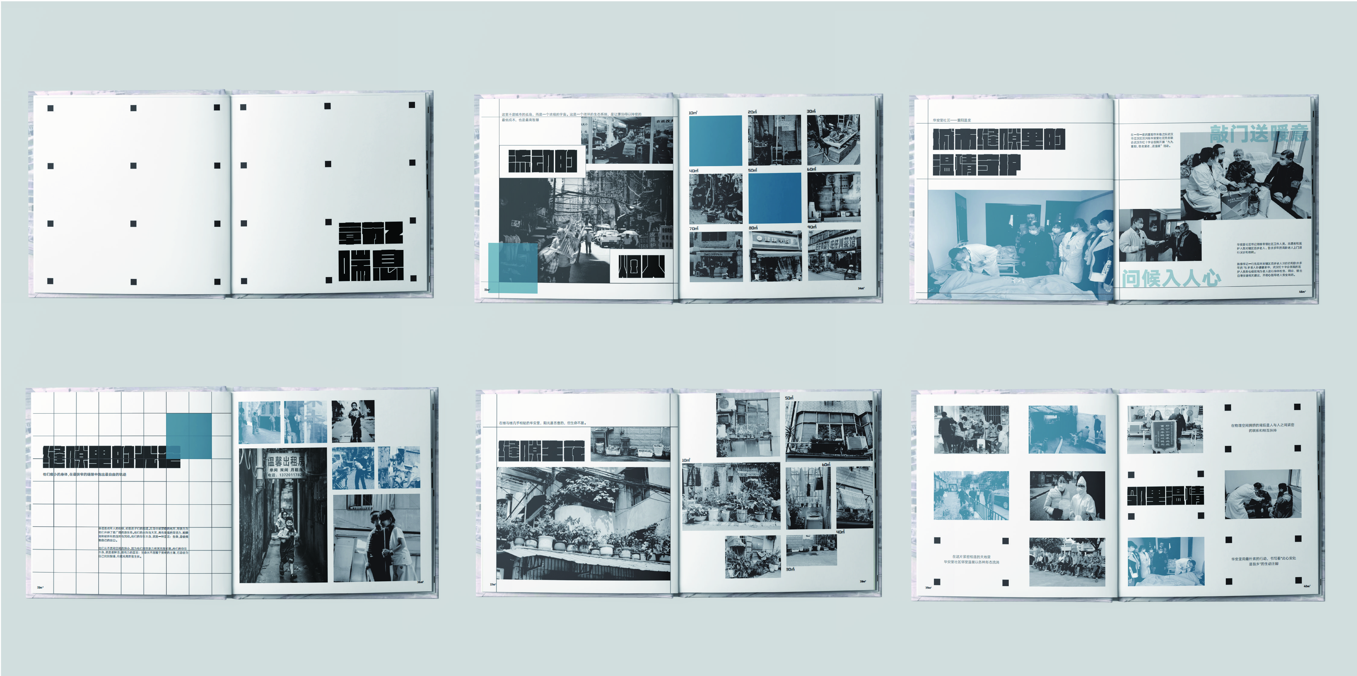 书籍以武汉华安里社区为背景,以“4.5平方米”为象征空间,聚焦城市边缘居住生态。通过纪实摄影、数据可视化与居民口述,多维呈现华安里独特的建筑肌理与市井生活。内页采用网格排版,以疏密对比映射空间压迫感,并用不同层次的蓝色暗喻人间温度。借影像、文字与材质触感,展现极端空间下个体的生存韧性与生活尊严,从而引发广大读者对城市化进程中边缘空间与人群的深度关注与人文思考。