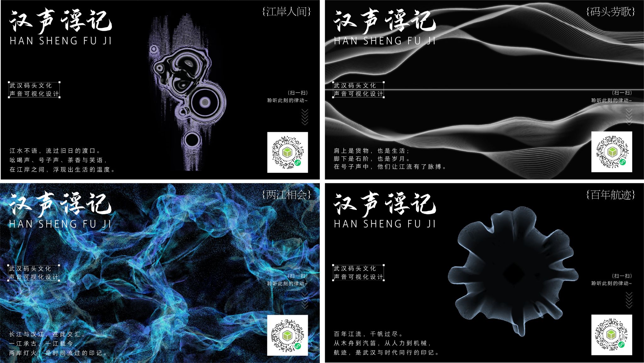 本次设计以武汉码头文化为核心对象,尝试通过书籍这一相对稳定的媒介,对逐渐淡出公众视野的城市记忆进行重新呈现。整体设计从老照片与声音可视化入手,将市井生活、劳工号子、江水波涛与航运变迁拆解为可被看见的音频图谱,再通过视觉与声音结合的方式重新再现。