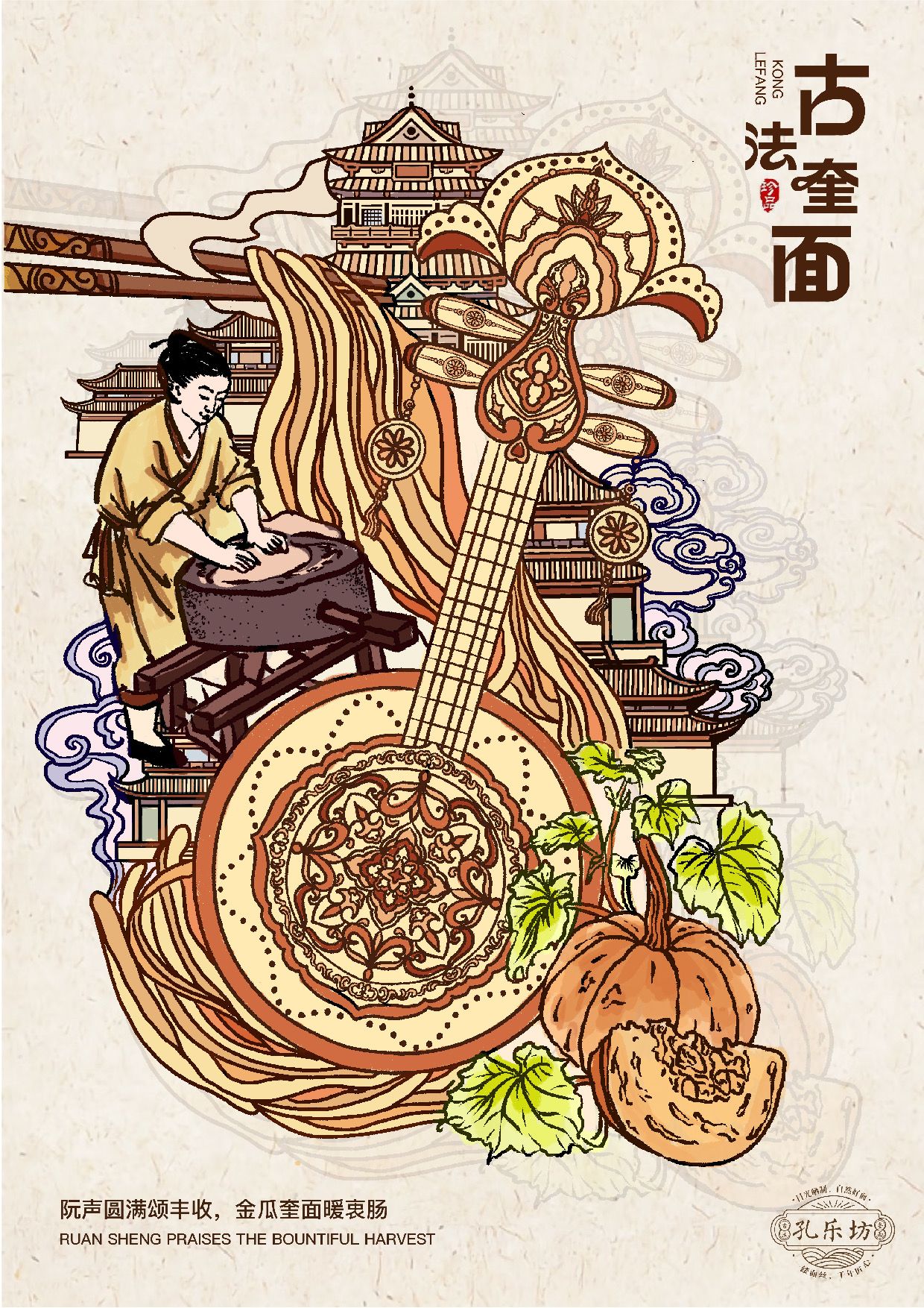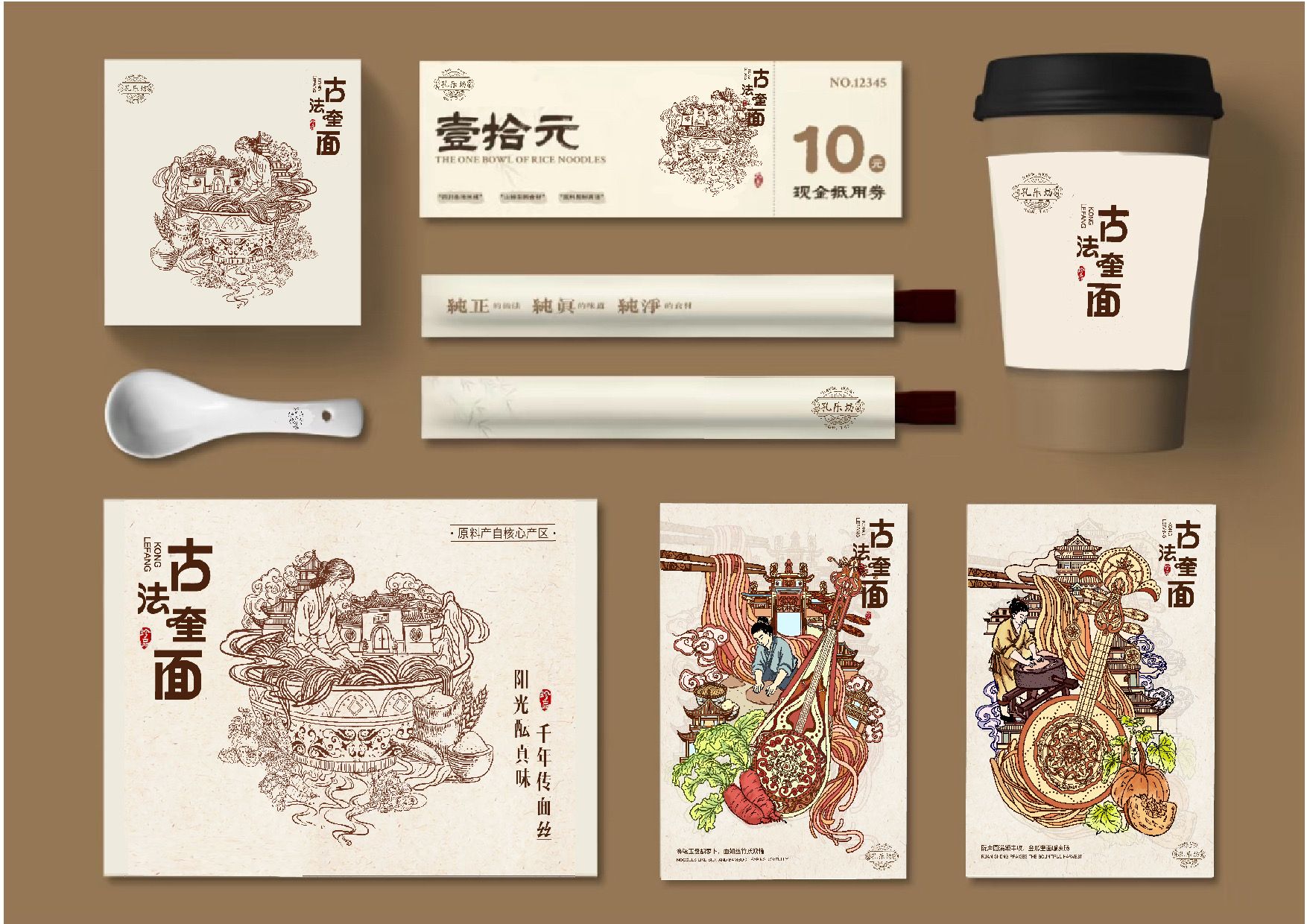 本设计为湖北非遗“谷城奎面”打造全新品牌形象,以“孔乐同源”为核心理念,挖掘“空心”特质并融合湖北非遗乐器,创立“孔乐坊”品牌。视觉采用新中式线描手绘,为六种口味搭配对应乐器插画,突破传统包装,形成完整品牌叙事。