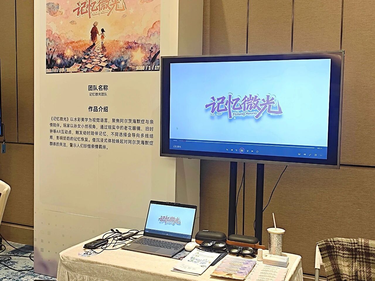 在上午的展位体验环节中,作品《记忆微光》凭借其温暖的情感叙事与独特的水彩美术风格,吸引了众多参会者驻足。团队成员热情讲解,分享其创作灵感源于对阿尔茨海默病群体的深切关怀,并通过一个“双向守护”的故事,向公众发出温暖的呼吁。