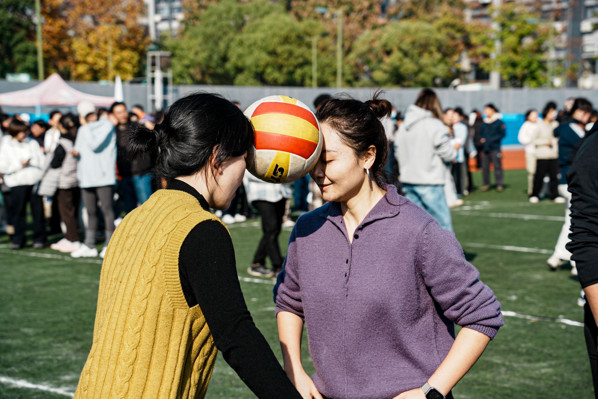 两名队员面对面用前额夹排球,双臂侧展侧向移动,是全场极具观赏性的默契挑战。30米赛道上,部分组合心领神会、快速通关,部分组合刚出发就出现球掉落的情况,滑稽又努力的模样成为全场快乐源泉,每一次通关都收获热烈掌声。