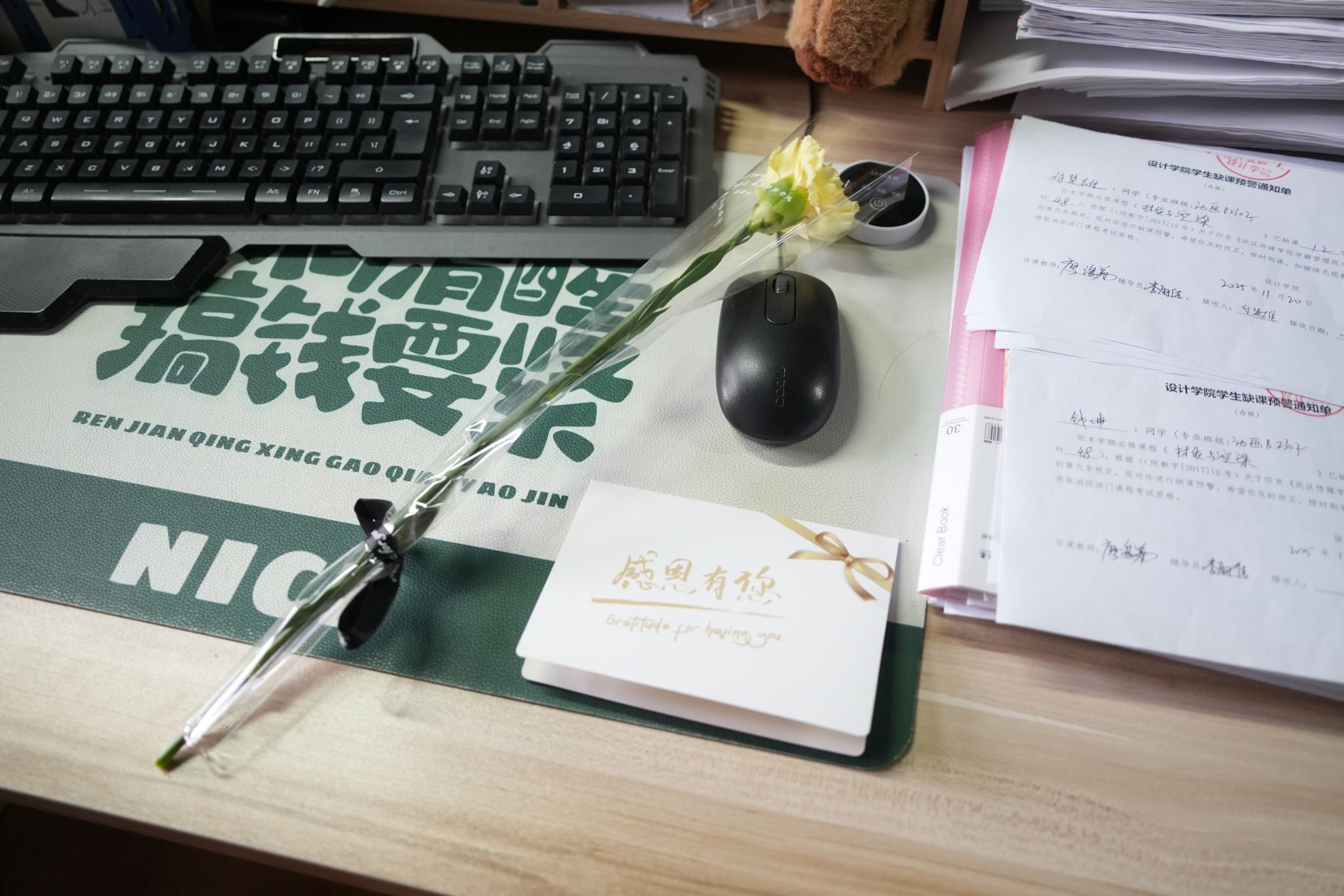 设计学院近期开展感恩教师主题活动,学子们发挥巧思,自制手捧花束、亲笔书写贺卡,走进老师办公室送上真挚敬意。
