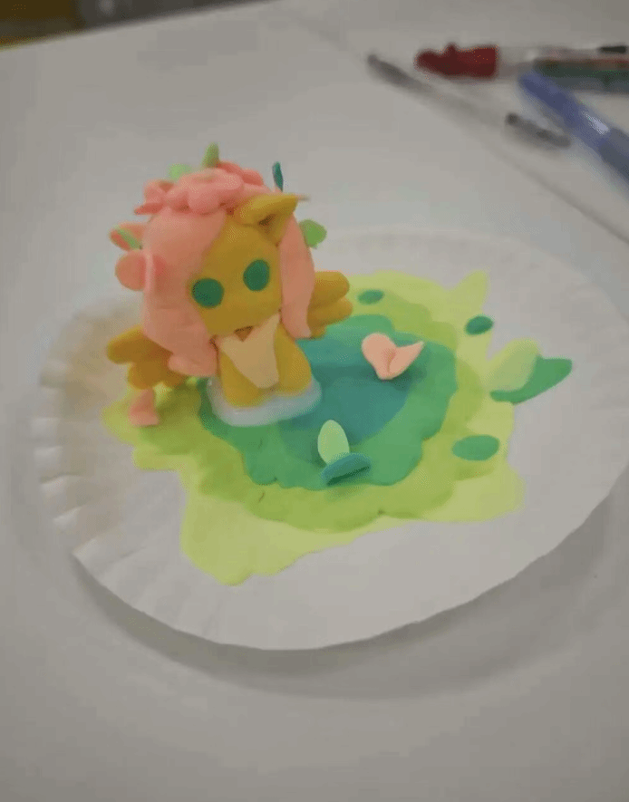 同学们欢声笑语,互相讨论。发散自己奇妙的思想,化作粘土造型的立体表达。每一份作品都带着他们独特的情绪。