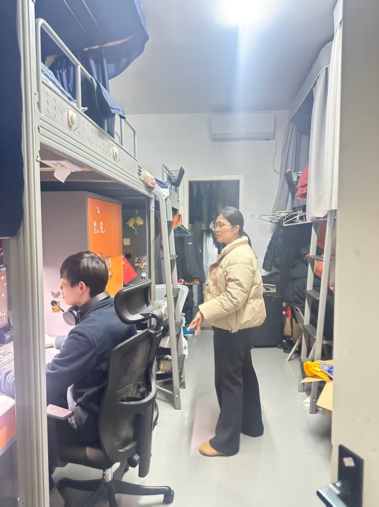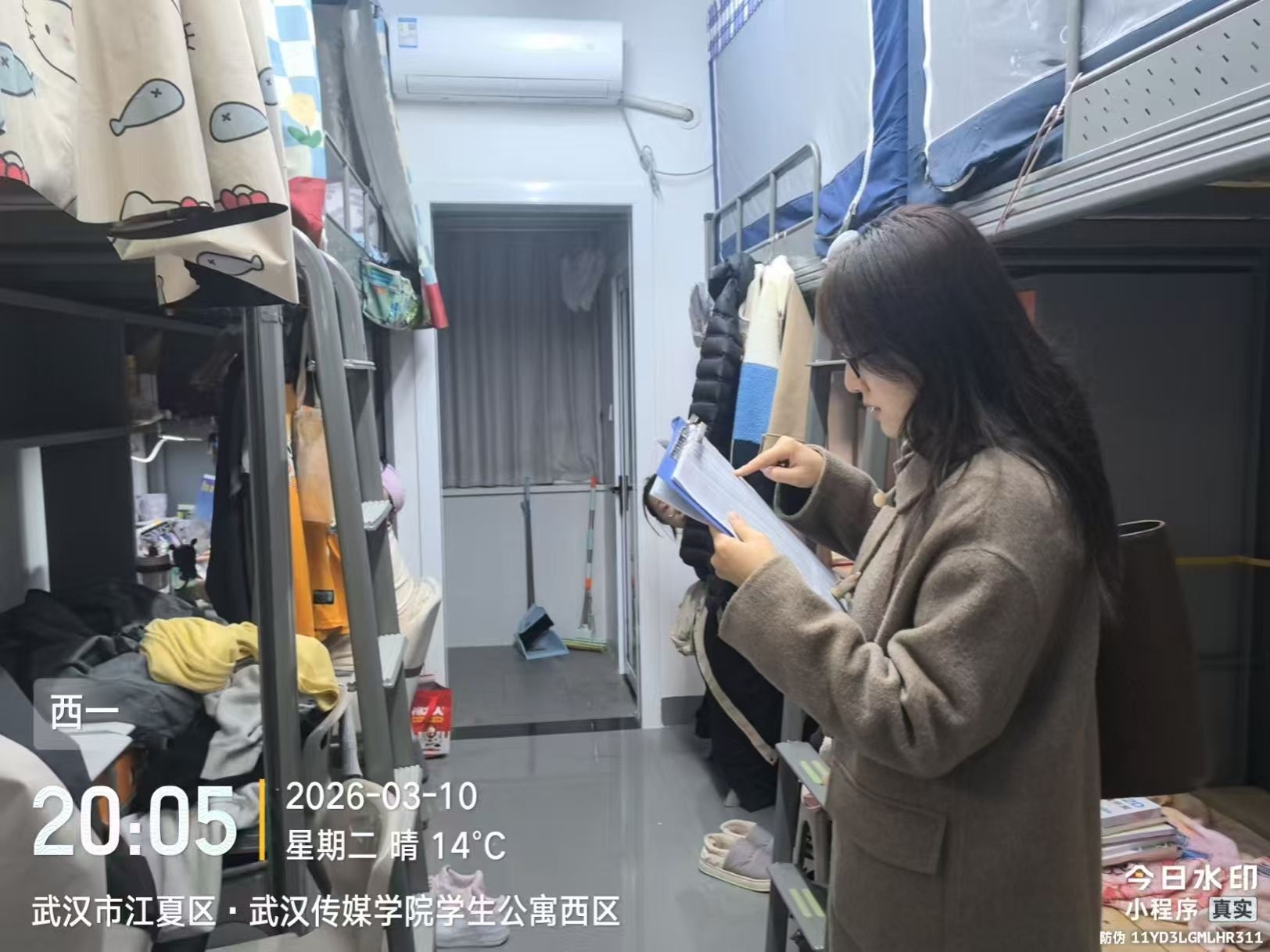 本次查寝,设计全体辅导带领学生干部组成联合检查组,深入各学生公寓楼,对学生宿舍进行全覆盖、无死角走访检查。检查组重点围绕用电安全、消防安全、内务卫生、违规电器使用等方面展开细致排查,严查私拉乱接电线、违规使用大功率电器、堵塞消防通道等安全隐患,同时对宿舍门窗、水电设施、卫生状况进行全面查看。
