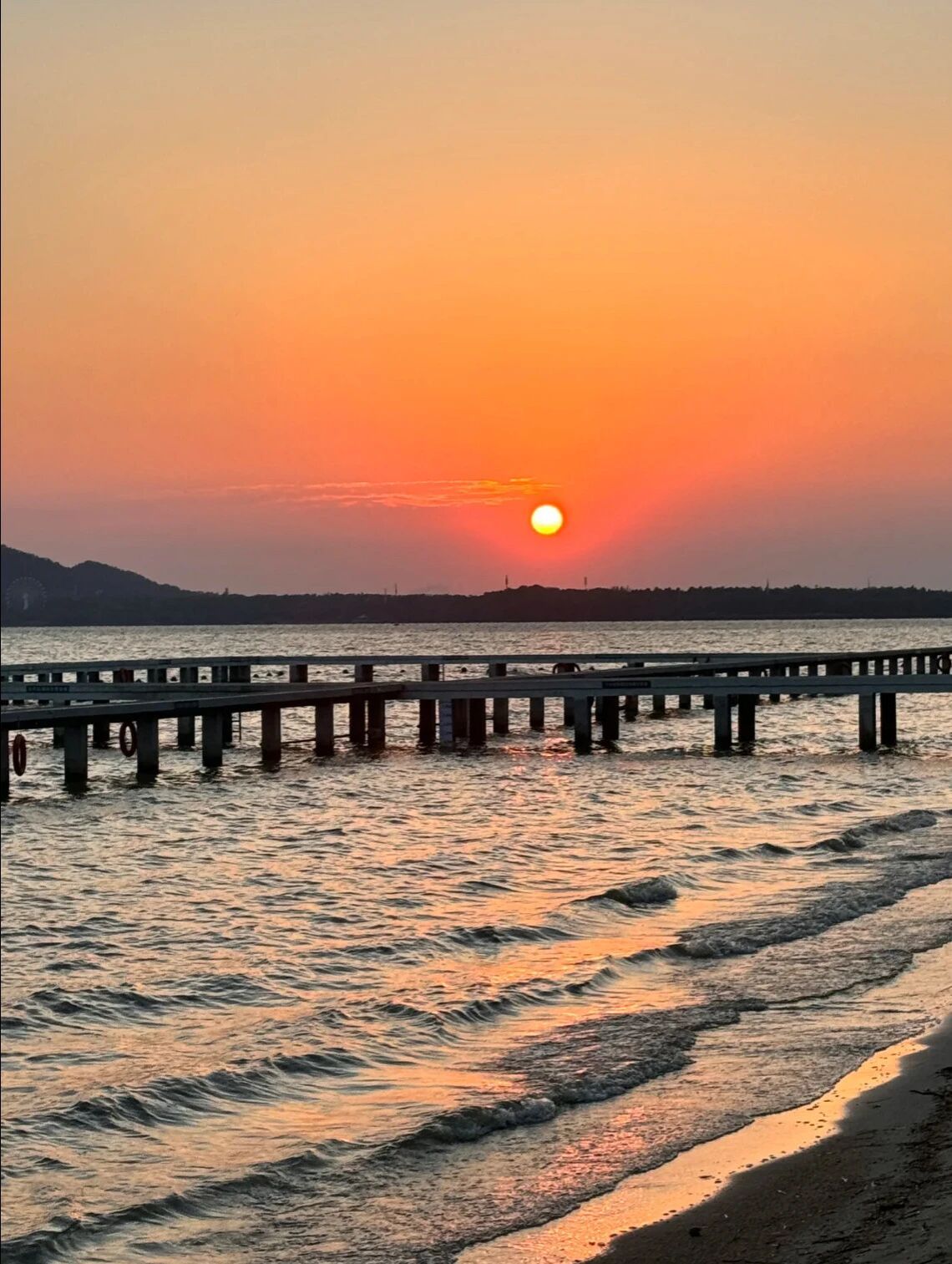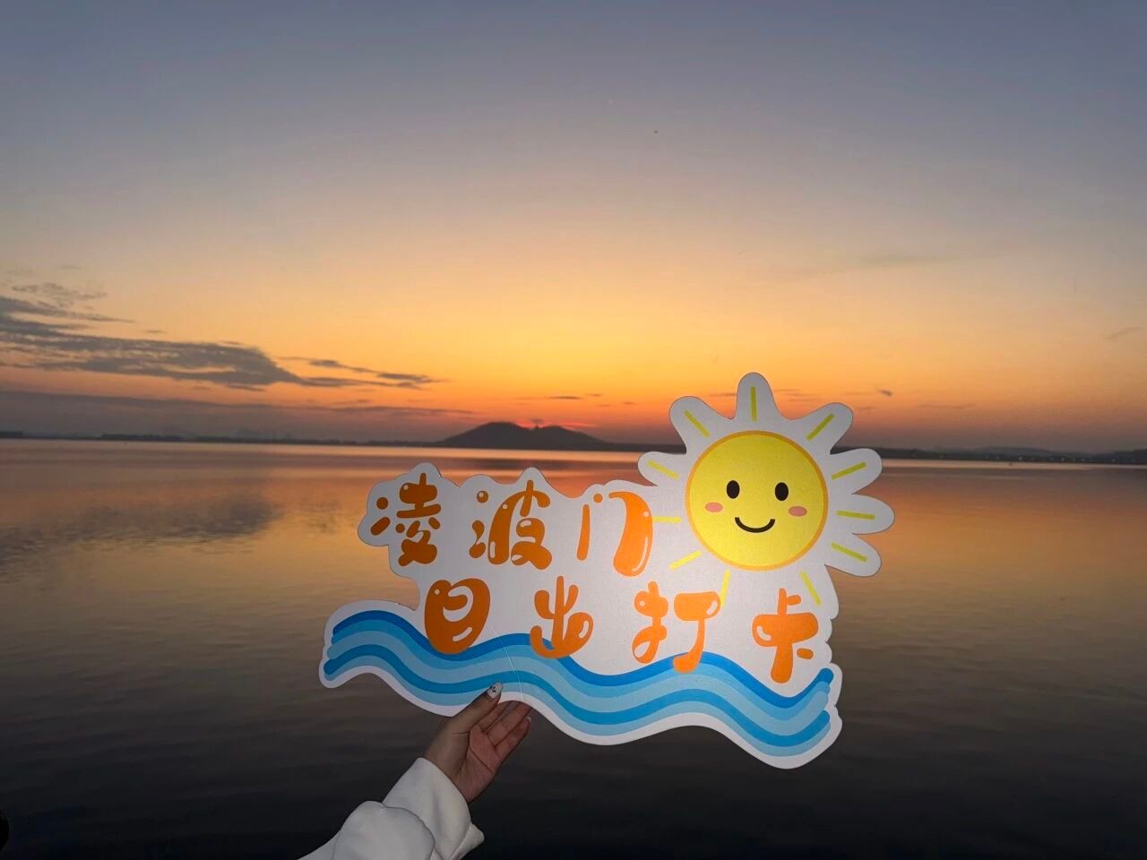 终于,天边泛起了一丝微光,渐渐地,微光变成了金色的光芒,太阳从地平线缓缓升起,将整个东湖染成了一片金黄。湖面上波光粼粼,与远处的山峦、建筑相映成趣,美不胜收。师生们纷纷拿出相机、手机,记录下这一美妙的瞬间。此时,东湖文旅贴心地为大家准备了拍照手举牌,上面印着充满活力的标语和东湖文旅的标志,为这场看日出活动增添了更多欢乐和纪念意义。