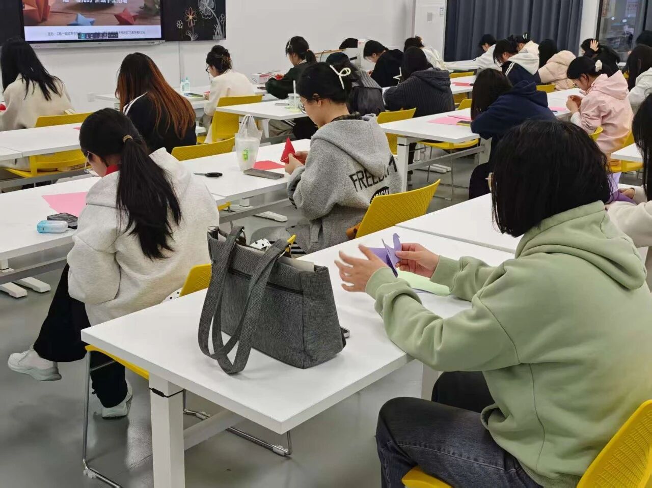 心灵的联结不只在言语之间,在C栋“一站式”学生社区“折一纸春意·赴一场繁花之约”折纸创作活动中,彩纸的翻折塑形,多样的工具,同学们的巧思创意,满是温暖与治愈!