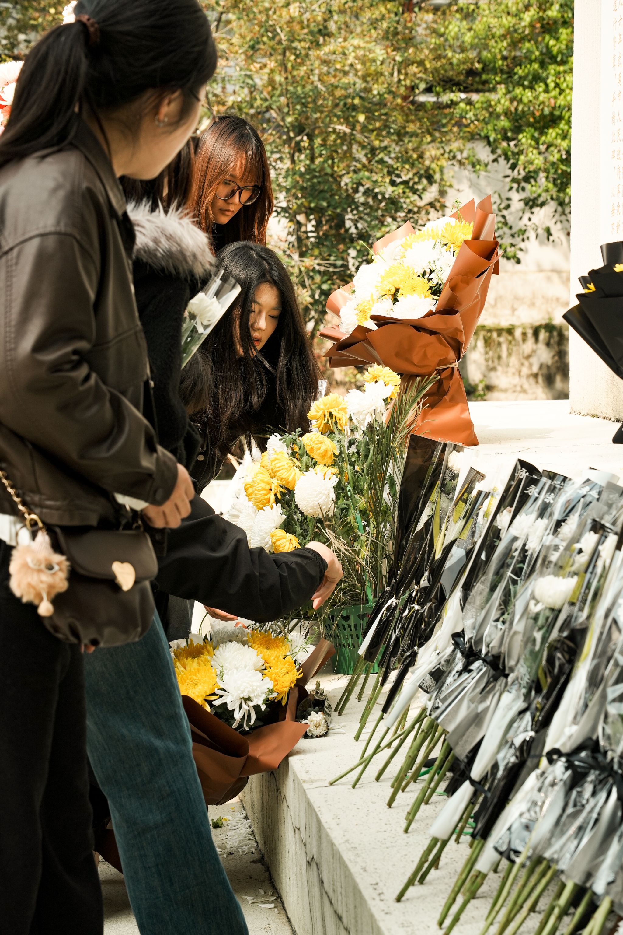 参观结束后,祭扫仪式在烈士纪念碑前正式举行。全体人员整齐列队、肃立默哀,随后依次缓步上前,将白菊花轻放于纪念碑基座前并鞠躬,以庄重的仪式缅怀革命先烈,表达崇高敬意。