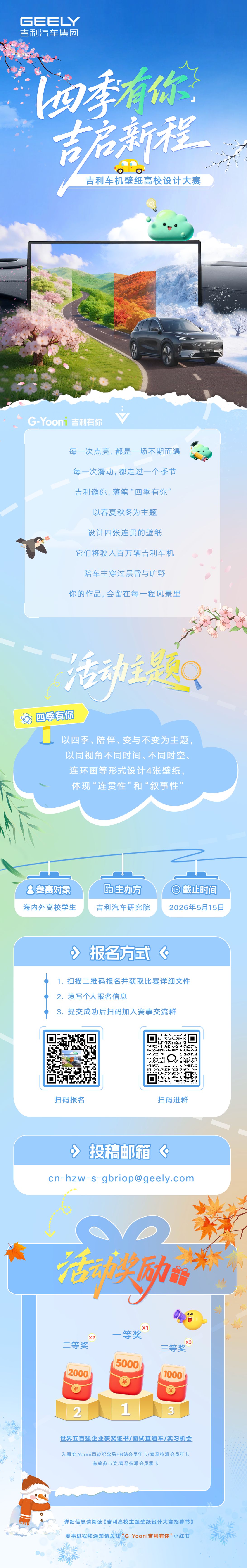 为丰富吉利车机内容生态,打造更有温度的人车交互体验,吉利汽车研究院正式发起“四季有你·吉启新程”高校主题壁纸设计大赛,面向全国高校设计新锐征集原创静态壁纸作品。优秀作品将有机会上线百万吉利车机、纳入G-Yooni品牌生态,同步赢取高额奖金、500强证书、面试直通与实习机会,诚邀青年设计师用创意点亮四季出行时光。